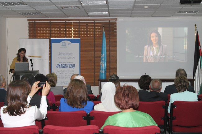 Jordan joins the world in celebrating on Sunday 4 May 2014 the World Press Freedom Day. The UNESCO Amman office held a full day event to celebrate World Press Freedom Day under the patronage of Her Royal Highness Princess Rym Ali, and in partnership with UN Women, Jordan Media Institute, Arab Women Media Center, and Imdad Media Center. As part of the event hosted by Jordan Media Institute, two consultations were held to gather insights and recommendations from representatives of civil society institutions, media stakeholders and professionals, to feed into the global Post 2015 Development Agenda dialogues and the Beijing+20 national review and advocacy initiative, with special focus on Women and the Media.<br />