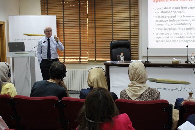 وأضاف أن الأردن، الذي يتوسط السياسة والنزاعات الإقليمية، يعد مكانا مثاليا لإطلاق حوارات عامة تشمل الى جانب الصحافيين الأكاديميين والمجتمع المدني ووسائل الإعلام والقيادات الدينية، من أجل بناء تحالف لتعزيز ضبط النفس الطوعي كسياسة بدلاً من استخدام القانون لدعم وتشجيع الصحافيين ان يكونوا أخلاقيين في تغطيتهم.<br />