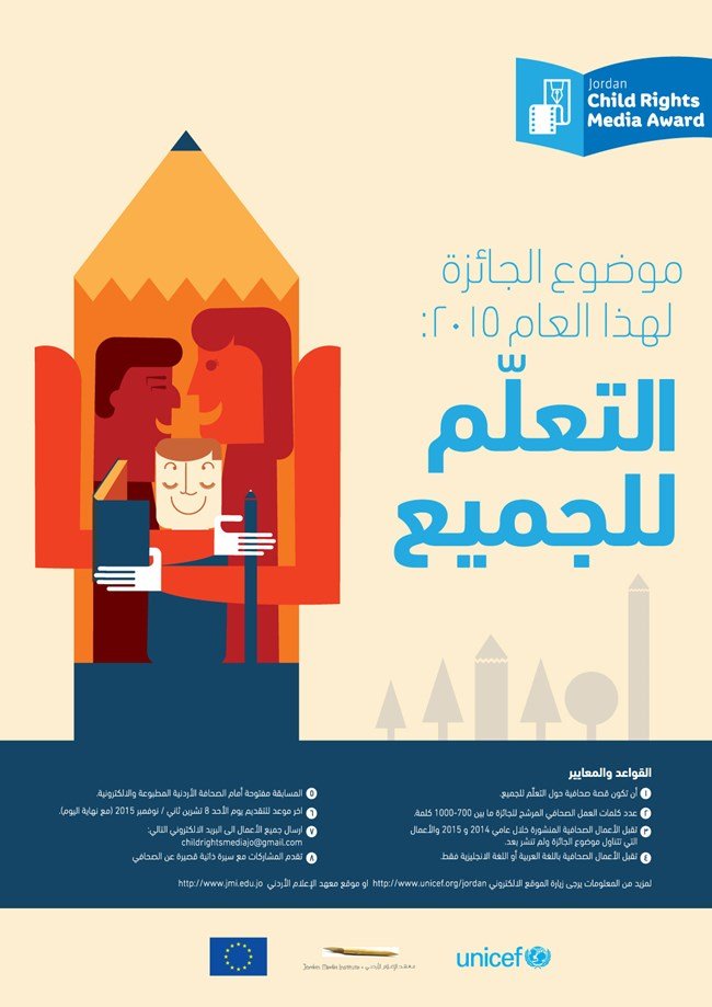أعلن معهد الإعلام الأردني ومنظمة اليونسيف عن تمديد الموعد النهائي لاستلام التقارير الصحافية المشاركة في جائزة صحافة حقوق الطفل حتى 15 تشرين ثاني 2015.<br />